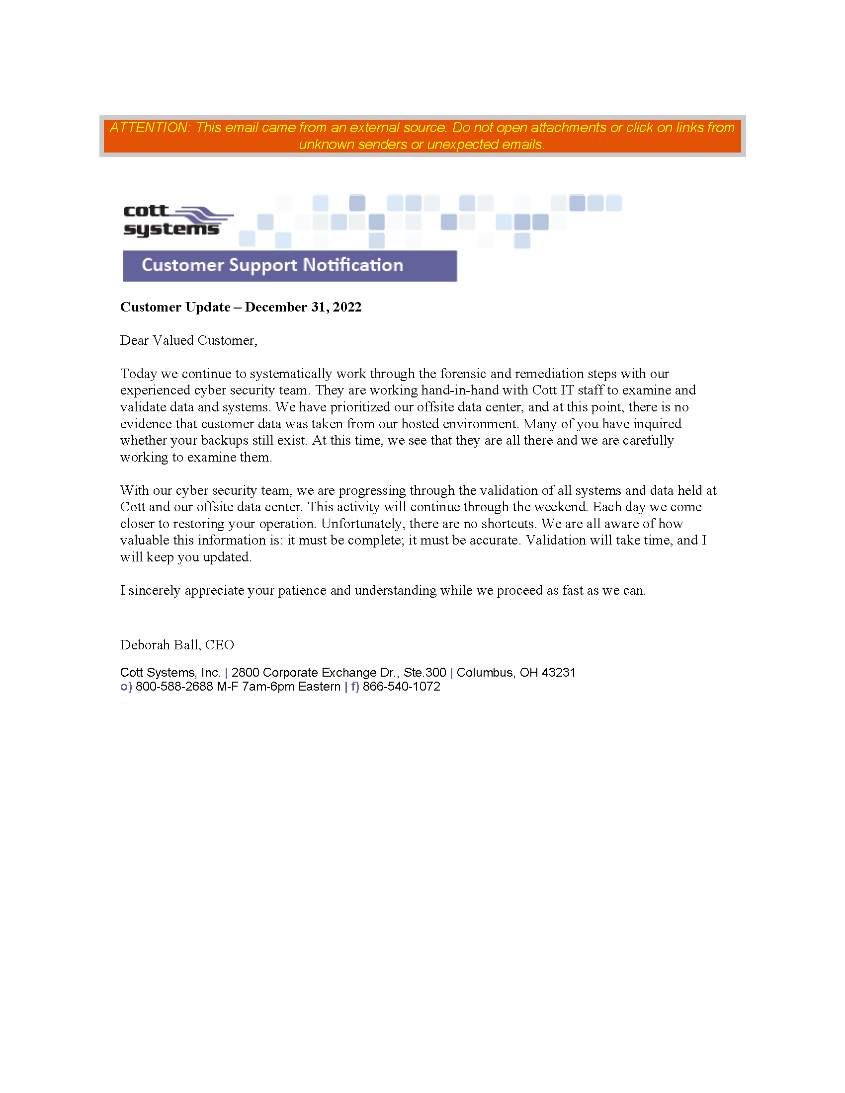 [Note - Cott systems provides land recordation services in 17 states, including several NY counties] To all valued Cott customers, As you know, on Monday, December 26, Cott Systems identified some unusual activity on our servers. In an abundance of caution, we disconnected all of our servers to isolate that activity within our environment. We then immediately engaged cyber specialists to investigate the event and they began a forensic analysis. It has been determined that Cott Systems is the victim of an organized cyber-attack. We have notified the FBI. Both the FBI and Homeland Security have indicated that they are aware of, and have been investigating, this particular group of criminals who operate worldwide. We will be sharing information as we proceed. We are working 24 x 7 with the forensic specialists to review all affected systems. While this is being completed, they are also working with us to identify ways to securely rebuild processes and restore functionality. There are many steps involved in the recovery from this cyber-attack. At this time, we are not able to give you a date when we will be fully operational or when connectivity and all of your services will be restored. You will be kept informed by a daily update. Finally, we are working on methods for you to be able to continue to at least manually process transactions. These will be provided in additional communications once we work out the details. Cott Systems exists to serve you. We acknowledge that time is of the essence and this is an emergency situation. Please accept our sincere apologies for the impact that this cyber-attack is having on your office. Thank you, | | | Customer Support| Cott Systems Cott Systems, Inc.|2800 Corporate Exchange Dr., Ste.300|Columbus, OH 43231 o) 800-588-2688 M-F 7am-6pm Eastern|f) 866-540-1072|e) support@cottsystems.com | | |